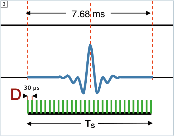 تصویر زیر از یکی از مقالات ژورنال MAGNETOM Flash که توسط Siemens منتشر می شه استخراج کردم که بیانگر این مفهوم است. اونجایی که با D مشخص شده نشان دهنده ی مقدار Dwell time است که اینجا ۳۰ میکرو ثانیه است و تموم اون خطوط سبز لحظاتی هستند که یک نمونه برداری از سیگنال توسط ADC صورت گرفته است. در برنامه نویسی توالی پالس با دادن مقدار dwell time و همچنین base resolution یا به عبارت دیگه رزولوشن تصویر در راستای کدینگ فرکانس، ADC می تونه متوجه بشه برای چه مدت زمانی باید روشن باشه و از سیگنال FID نمونه برداری بکنه.